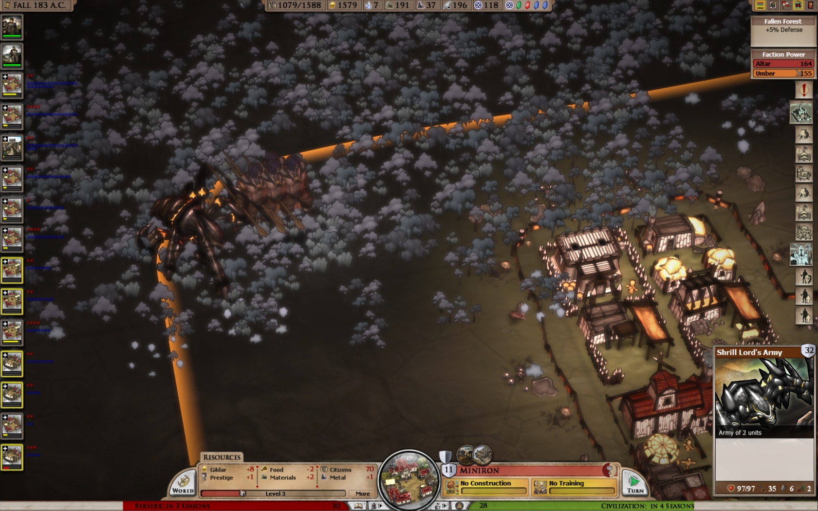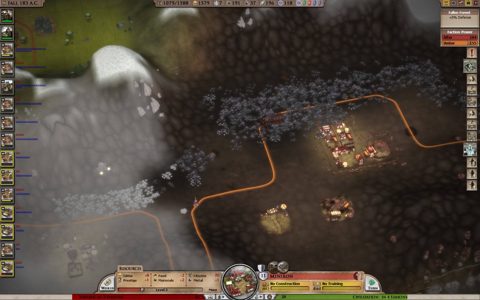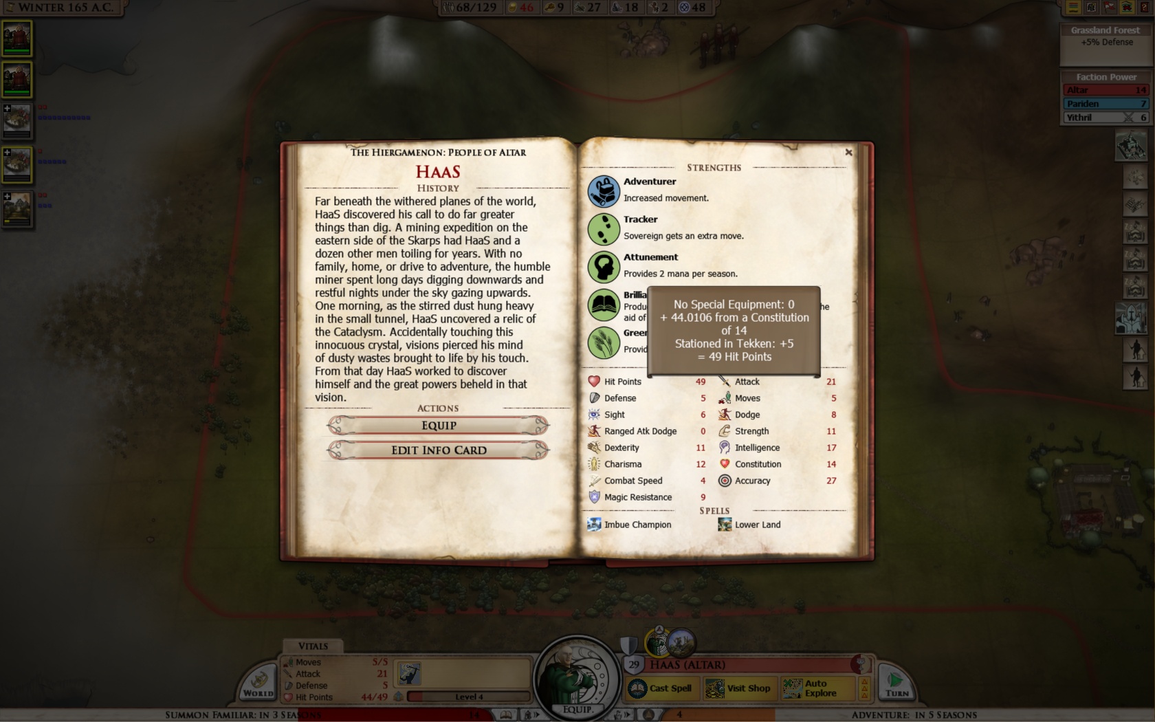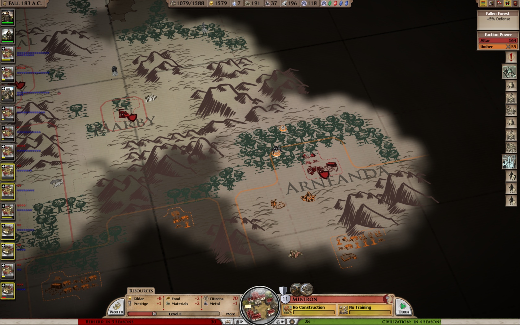 Áh, elakad a szavad, ha meglátod... eddig olyan vanília volt az egész, mint az Oblivion, most meg! Eddig hetvennégyet lépve ide-oda teleportálva félistenként kattintgatott a játékos, most Organized nincs, csak Tracker (+1 mov) - kérdés ugye, hogy így van-e értelme, eheheh - és a Teleport 15 mana (!!!). Magyarul szinte egy vagy a sok közül... teljesen átalakult a karakter, teljesen. Csomó értelmes, nehezítő változás van: Merchant -1 food/turn, Study -1 gildar/turn. Bejött a karakternél a Green Thumb (+2 kezdő kaja, amivel... áááh...)