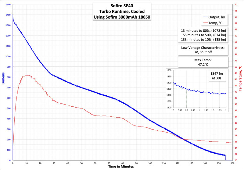 Igen a be esés a túl melegedéstől , le csökken a fényerő , itt az én SP 40-em ami 1200 lumen , de a tesztben 1400-at mertek, turbón