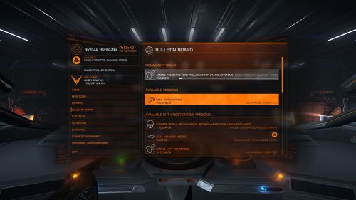 Ezt lehet soloban? Ezt nem is tudtam. Ez akkor gondolom úgy működik ha soloban akarom csinálni, hogy megnézem az Active Community Goals aktuális listát, oda megyek a cél rendszer/cél állomásra és a Bulletin Boardról felveszem a CG küldit aztán mehet a móka?