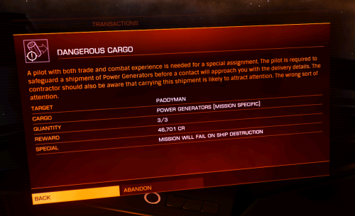 Játsszál tovább, de ne menj túl messze a küldetésfelvételi helytől (azért, mert a cél is arrafelé lesz, amúgy mindegy, hol leszel), 5-10 perc múlva majd kapsz egy üzenetet, hogy Mission Updated, akkor látni fogod a felvett küldetések paneljén, hogy hová kell menni. A cél rendszerben a csókát (PADDYMAN) kell majd megtalálni (SC-ben többnyire), aki írja majd, hogy kövesd őt (SC-ben hagy majd egy Wake-et, ott kell neked is kiugranod), ott még írogat neked, megint Mission Updated, és az adott rendszerben a nevezett állomáshoz kell majd elvinni a cargo-t.