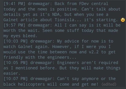Valamiféle sztori update lesz. Drew Wagar az egyik hivatalos ED regény szerzője, és egy ideig Galnet cikkeket is írt, míg az FD át nem pakolta házon belülre az egészet. Az utóbbi időben duzzogott is eleget, hogy a Frontier hanyagolja a játék háttértörténetét és kiszúrja a szemünket a soványka UA rejtéllyel és a PP heti eredményeiből automatikusan generált történésekkel. Most úgy látszik lesz némi előrelépés és újra bevonták őt is.