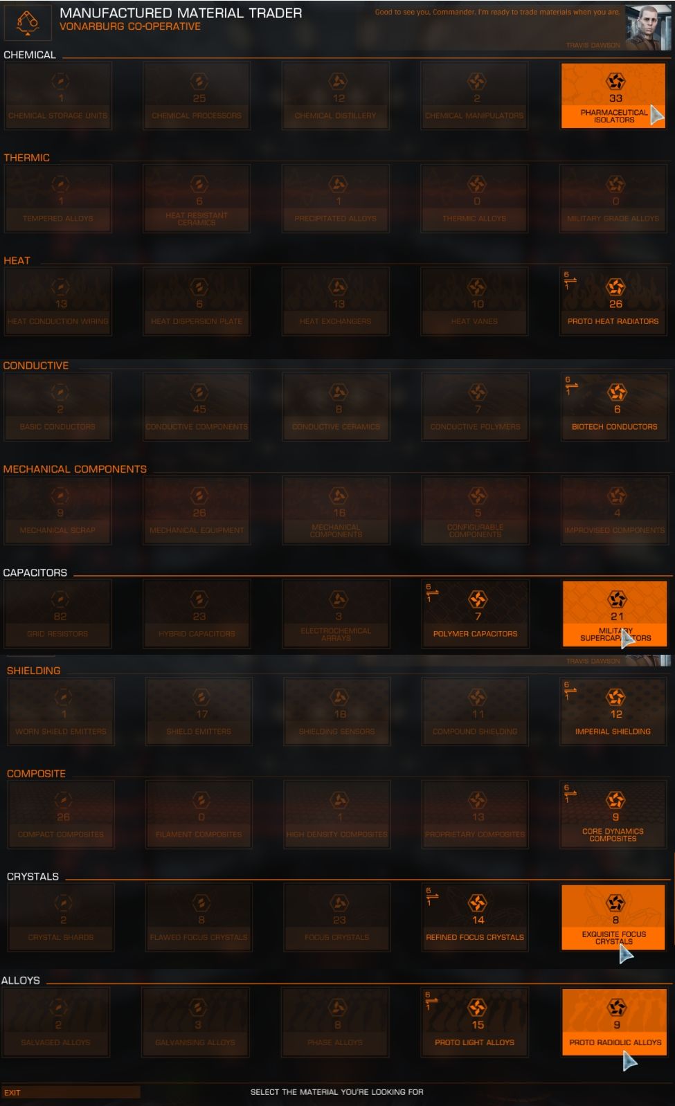 Egy-egy anyag gyakorisága szerinti lépcsőfokonként négyzetesen nő az értéke. Pl 1 db military supercapacitors-ért(very rare) 6 db polimer capacitors-t(rare) kapunk, de az egyel még gyakoribb electromchemical arrays-ból már 36 db-ot, a következőből meg már 216 járna, ami ugye a 100-as korlát miatt már problémás dolog. Viszont ezek a számok csak akkor ilyen jók, ha azonos alcsoportba tartoznak(a most említettek pl a "capacitors"-ok halmazába). Ha viszont különböző alcsoportokba tartozó anyagokat akarunk cserélgetni, azt lehet ugyan, de nagyon fontoljuk meg, mert akkor már összehasonlíthatatlanul kedvezőtlenebbek a váltószámok. Pl két különböző alcsoportba tartozó, egyforma gyakoriságú anyagért már hatot kell adni egyetlen db általunk kívánt tételért, és az egyéb számok is nagyon durván romlanak. Ha már itt tartunk, ezek a material kupecek amúgy is pofátlan haszonkulccsal dolgoznak, ha cserélsz mondjuk valamit 1 a 6-hoz, és a példa kedvéért vissza akarod cserélni, már csak 1 a 3-hoz lesz az arány.