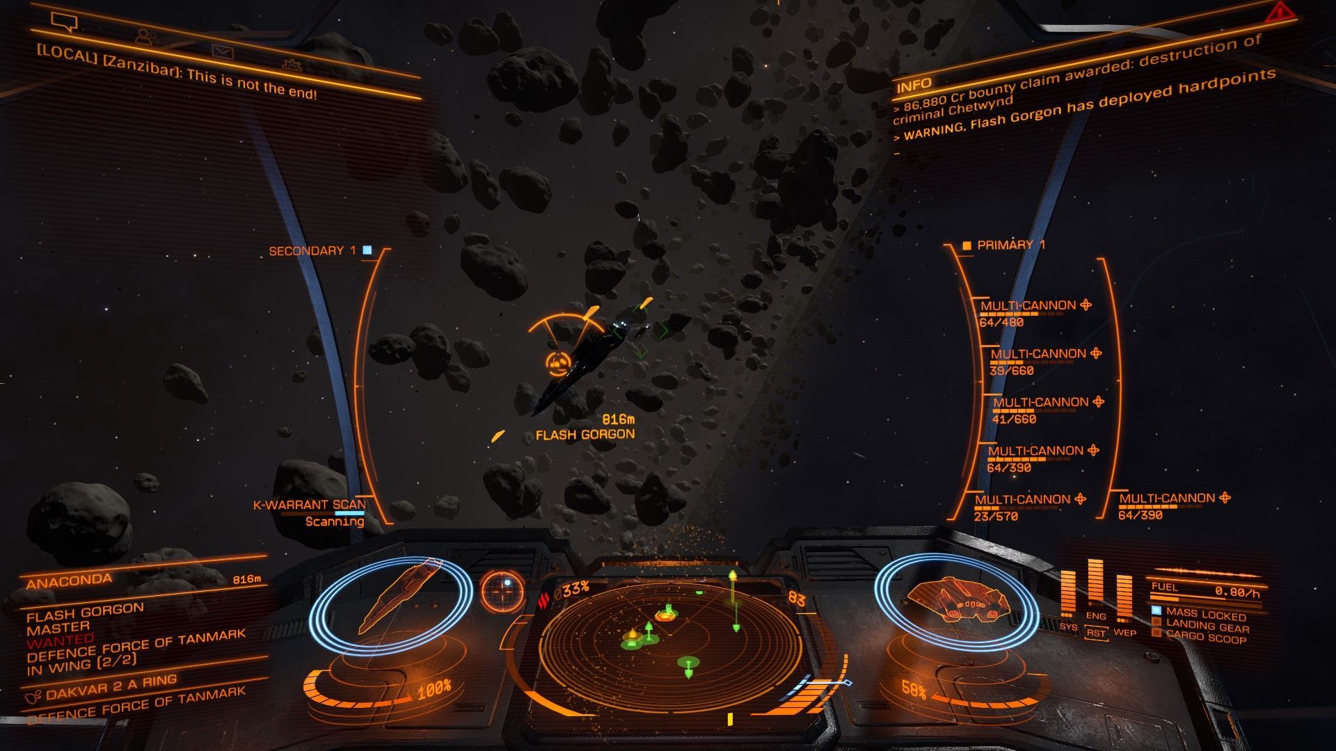 Én egy Viper MK IV-el nyomultam, a cimborám Federal Dropshippel, s kalózvadászós Wing-es küldetést csináltunk 17M-ért. Voltak olyan hajók, amikért 600-800e kreditet is kaptunk, csak bounty formájában a küldetés közben. Arra gondoltam, hogy ha nem ezekkel a kicsi hajókkal lőttük volna őket, sokkal kevesebb lett volna a fejpénz, hiszen könnyebb, rövidebb lenne a harc. De majd kipróbálom az új Mambával