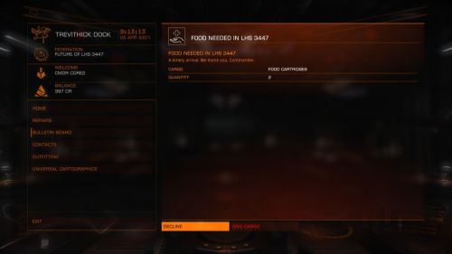 Noob kérdés #1: Bent vagyok a solo mód elején egy dokkban, el kéne vinni a kaját az LHS 3447-be. Elfogadtam a küldetést, de a cargoban nem látszik semmi. Próbáltam elutasítani a küldetést, nem engedig. A Give cargo pirosan világít. Mit csinálok rosszul?