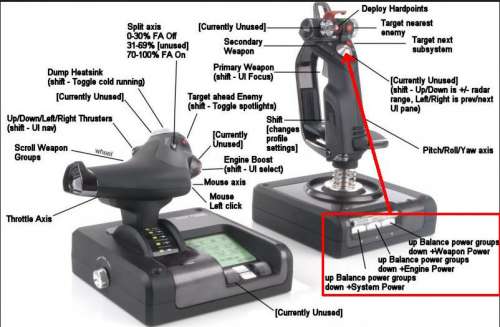 Én egy "kritikus hibát" látok ebben a kiosztásban. A többi ízlés dolga. Az energiaelosztás szerintem nagyon rossz helyen van a joy talapzatán. Harcközben bal kezed a gázkaron, jobb kezeddel a botba kapaszkodsz. Így viszont baromi nehézkes a folyamatos energiaátcsoportosítás miközben épp egy ellenséggel fogócskázol. Nekem fel van téve a bot tetején lévő Hat Switchre (piros nyíl mutatja, hova tenném) Természetesen ez csak az én véleményem!