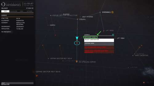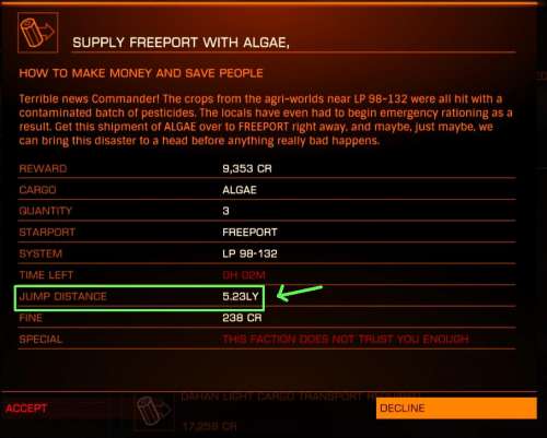 - Az aktuális küldetéseknél feltüntetik a feladathoz szükséges hatótávolságot:Végezetül a Galaxy mapon látható a kijelölt rendszer távolsága (csak nullás képet találtam most