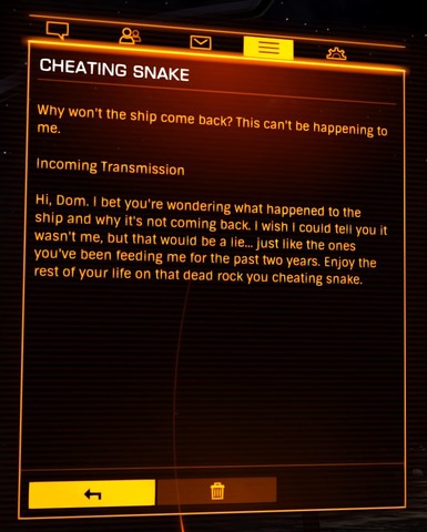 https://forums.frontier.co.uk/showthread.php/308075-End-of-the-RoadA fickó megírta a okulásul a történetét, miszerint elszámította magát az ugrásokkal és 1000 fényévnyire Beagle Point-tól ott ragadt két rendszer között. Csak FSD boosttal tudna továbbmenni, de elfogyott az alapanyag hozzá, és a két rendszer egyik bolygóján sincs olyan material, ami jó volna neki, pedig 1 darab germanium elég volna a továbbjutáshoz.