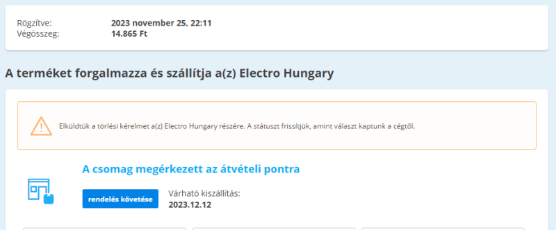 A törlésre ahogy korábban írtam nagyjából 5-10 perccel a megrendelés és fizetés után nyomtam rá, azóta is ez van kiírva. Közben ezen a 12.12. napon kivitték csomagautomatába és azóta is ott csücsül. Ha minden igaz ma visszaviszik, elvileg máig lett volna lehetőségem átvenni, de a pénzemet várom nem a törölt rendelésem kiszállítását...