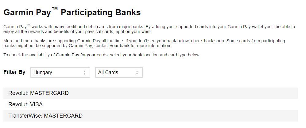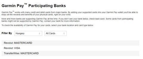 a garmin pay saját weblapja szerint hivatalosan támogatott magyarországon is a revolut (visa és mc egyaránt) és a transferwise (mc) kártya is.
