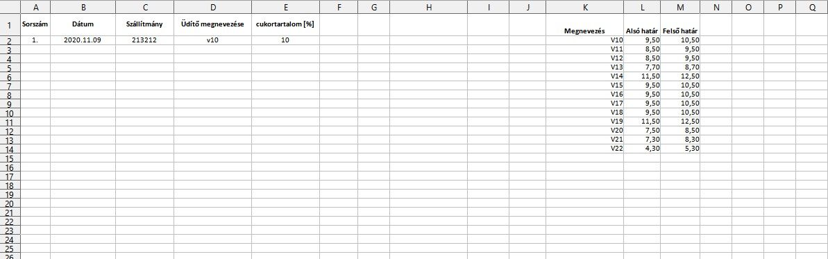 Tehát D2-be beírom az üdítő típusát(V10), E2-be pedig a mért cukortartalmat és a K2:M14 között található adatok alapján szeretném, ha az E2 cella színeződne, jelen esetben zöldre, mert a 10% határértékek(V10 esetén 9,5 - 10,5%) között van.