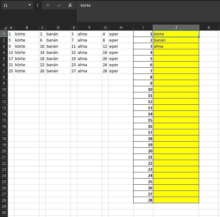 Adott a táblázat, a sárga J oszlopba szeretném képlettel belerendezni, hogy megkeresse az I oszlopban lévő értéket az A1:H7 tartományba és a mellette jobbra lévő cellát kapjuk értékül. (pl.: J28 cellába legyen írva, hogy eper)