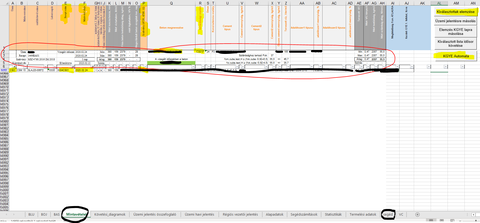 Fejlécezett tábla. 2-5 sorig összesített adatok az alatta szűrt adatállományból kivéve, csak a leszürt adatokra. Ez a "Mintavétel" fül. A segéd fülön végzek néhány segédműveletet. Az érdemi számítást, ellenőtzést, kiértékelést a 2-5. sorig elvégzem. A kiértékelés után ezeket a sorokat másolom ki az eredmény fülekre. Az ellenőrzés az Üzem, Mintavétel ideje alapján, Receptszámok szerinti csoportosításban történik.