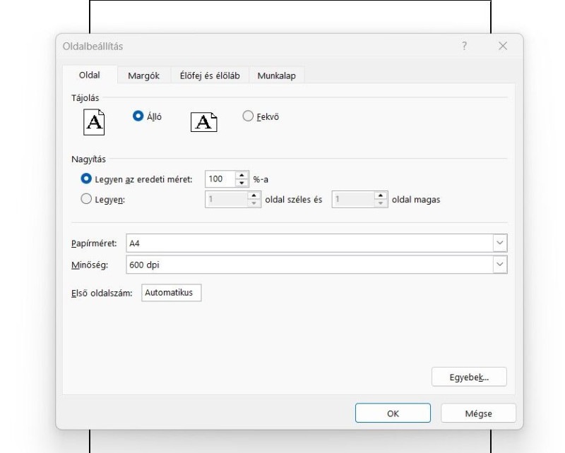 Az oldalbeállítás paraméterezésben kísérletezhetsz részben a legyen 1 oldal széles 1 oldal magas beállítással, illetve a legyen az eredeti méret x %-a. A nyomtatási képen láthatod az eredményt kinyomtatás nélkül.