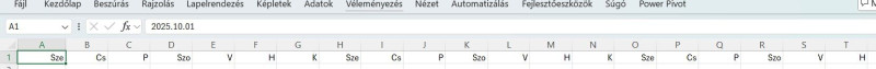 Az első sorba - ahova a napok kerülnek - dátumot írsz. A példádban C1-be 2025.10.01. Ezután cellaformázás, egyéni - magyarban nnn, angolban ddd - a napok egyértelmű kezdőbetűit látod a cellában. Ezután jobbra húzod és a húzással kitöltődik a növekvő dátumokkal.