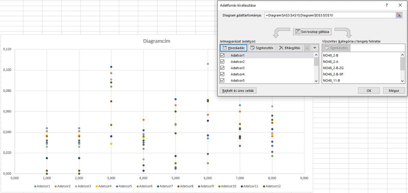 Hiába állítom be a vízszintes tengelyre az 1. oszlop értékeit (ami mellesleg nem értem, miért nem szerkesztehető), számokat jelenít meg helyette. A másik pedig, hogy én nem szeretnék ennyi adatsort látni. Van az a 12x10 értékem, és én ezeket egy adatsorként szeretném, nem oszloponként külön-külön adatsornak. Tudnátok ebbe segíteni, ezeket hogy tudom megcsinálni? -
