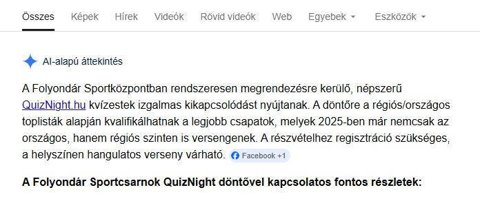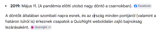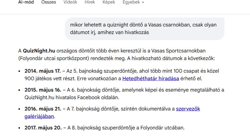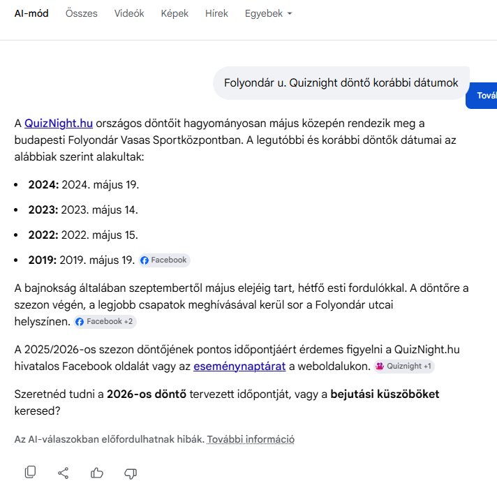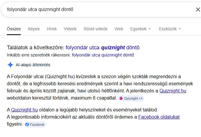 Neked nem ismeretlen a téma, meg akartam fejteni, hogy mikor lehetett az egyik kvízes döntő, mert nem rémlik, hogy mennyivel lóg túl az 5+ éven. Rákerestem, hogy "Folyondár u. Quiznight döntő". AI alapú ezt emlegette: