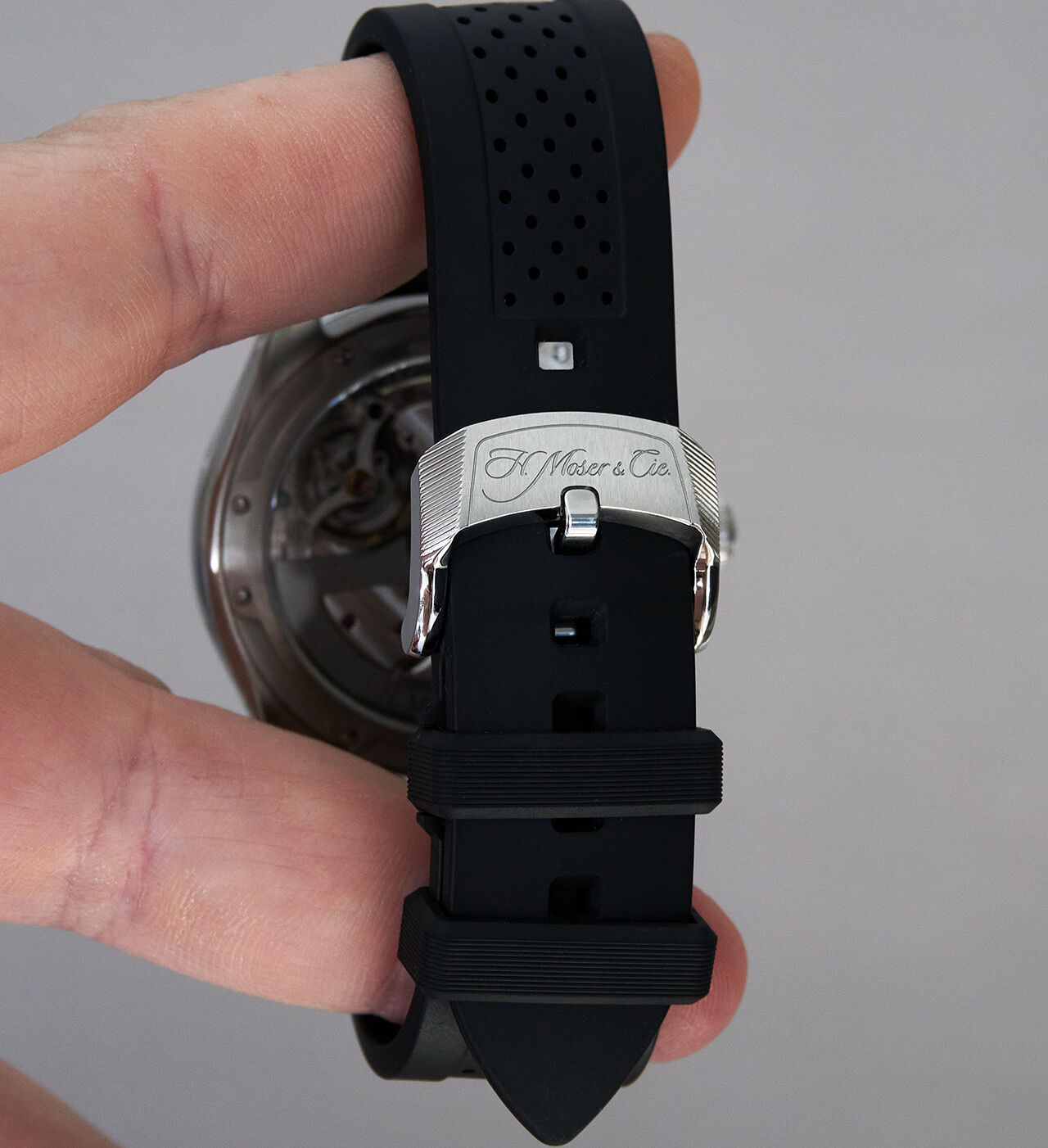 Mosernél ez a sportóra (nem nemesfém a tok, 120m vízállóság), gumival van gyárilag (eddigi legjobb minőségű/érzetű gumi, amit órás vonalon tapasztaltam eddig - így mondva jól hangzik, amúgy kb olyan mint a gyári apple watch szíj).