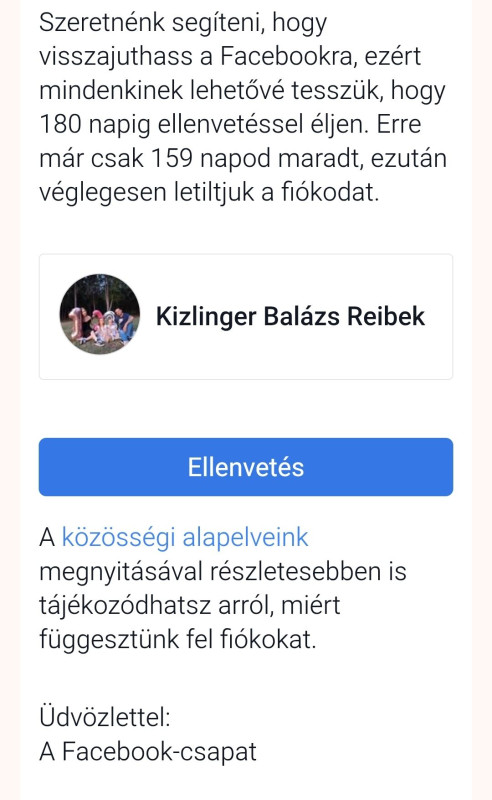 Egy mód van hogy tudj kommunikálni: ha előfizetsz (még tiltás előtt) valami olyanra hogy "facebook business" (pontos nevét nem tudom) és akkor kvázi lesz "dedikált" elérésed go d esetén.