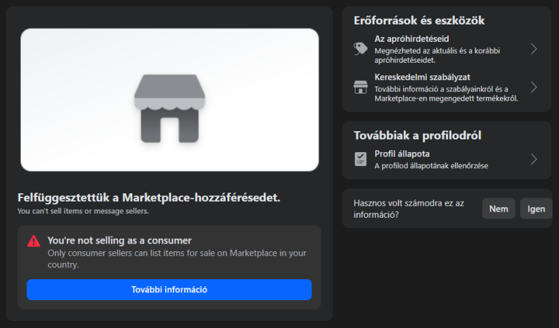 Üdv. Marketplace felfüggesztésben van valami előrelépés? Édesanyámat is bannolták teljesen indokolatlanul, és most szegénykém teljesen kétségbe van esve.