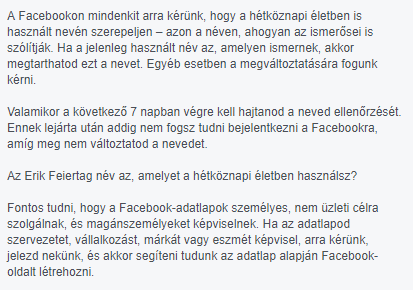 a Facebook az alábbi baromsággal fogadott. Meg kell erősítenem, hogy a név, amit használok, valós. Mi ez a hülyeség? Ráadásul a megerősítéshez be kell küldenem hivatalos okmányt is. Hogy gondolják? Van valami support oldal ahol le lehet ezt a baromságot tárgyalni?