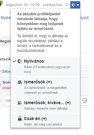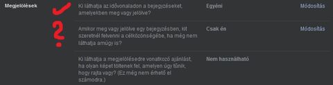 (végül bonyolultabb lett a megoldás, már majdnem feladtam, de végül megértettem rendesen a működést)Szóval a kérdőjeles részre nagyjából igaz, amit írtam. Ha a bejegyzés tulajdonosa készít egy bejegyzést, amin megjelöl, akkor te kiválaszthatod, hogy kik kerüljenek még a láthatósági halmazba, ha a tulajdonos úgy állítja be, hogy "ismerősök + megjelöltek ismerősei" (azért így írja a tulajdonosnál, mert az "ismerősök" az alapértelmezett beállítás a kérdőjelesnél). Ekkor ha "csak én"-re van állítva a kérdőjeles sorod, akkor a te ismerőseid nem fogják látni a bejegyzést sehol, ha nem ismerősei a tulajdonosnak vagyis mégsem kerülnek be a halmazba.