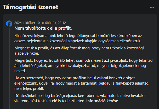 Ez ilyen hatékony. Nagybátyám profilja alapján létrehoztak egy nagyon hasonló profilt idegenek, ugyanazzal a névvel, a nyilvánosan elérhető néhány képet is felmásolták és elkezdték bejelölni az ismerőseit. Rákérdeztem nála, hogy ő-e az-e, mondta, hogy dehogy. Természetesen jelezte ő is a FB-nak a problémát, illetve jó sok ismerősnek írtunk, hogy jelezzék ők is az új, kamu profilt. Én április 11-én jelentettem, és most, október 10-én jött válasz FB-tól, hogy megvizsgálták a profilt, és szerintük teljesen rendben van. Oké.