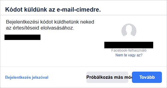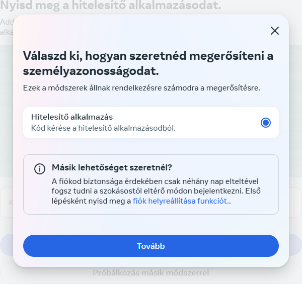 A "Próbálkozás másik módszerrel" opciót választom, mert nem lett felvéve a Facebook a Google Hitelesítőben. Ekkor az alábbi ablak jelenik meg:
