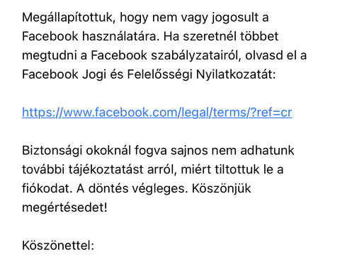 Ebben a “hullámban” odaveszett a teljesen ártatlan accountom, vele az Instagram is és minden ahol a FB logint használtam. Soft bant kapott a telefonom, csak teljes restore (újratelepítés) után tudtam belépni. Még a biztonsági mentés is visszatette a tiltást, abban is benne volt ez a tiltóbejegyzés.