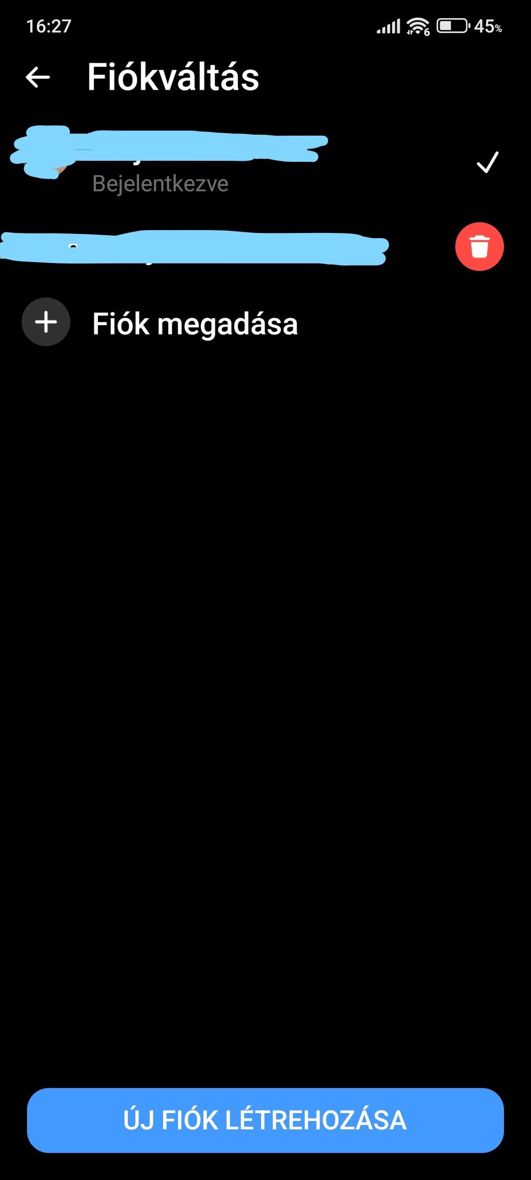 A fiókok kezelése menüpontban hosszan nyomva az inaktív fiókot, megjelenik a kuka, amivel elvileg törölni lehetne a telefonról...