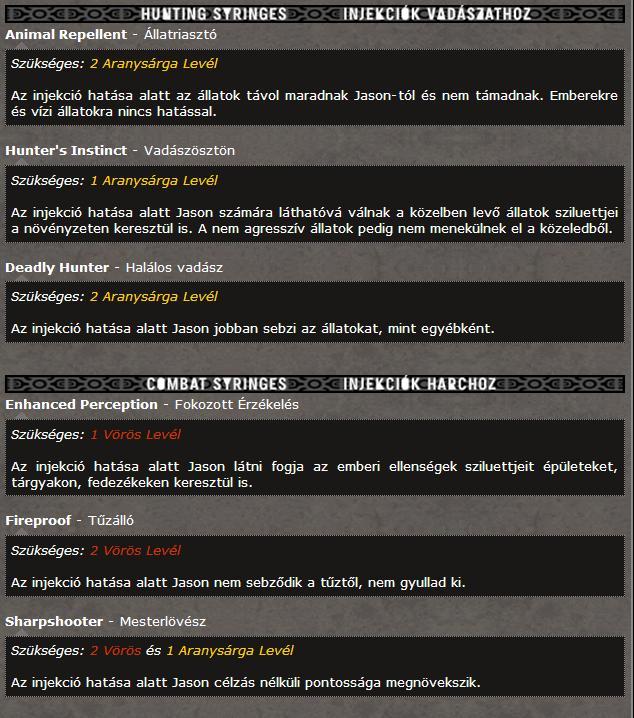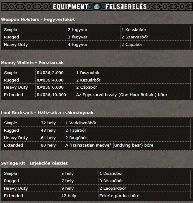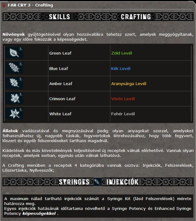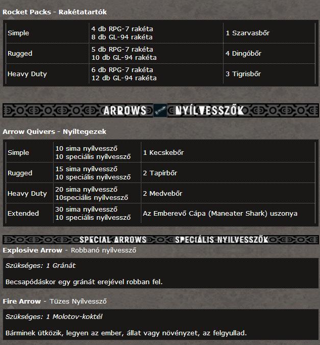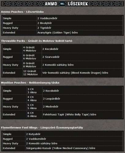 Nem tudtok valami jó leírást vagy táblázatot, hogy mihez mi kell, amit kinyomtathatok hogy szem előtt legyen?Illetve a zsákom talán a kettes szinten van, amit összeszedek cumót, nem tudom valahova "elrakni", hogy ne a zsákban foglalja a helyet amíg nem tudom felhasználni (gondolok itt állatbőrökre, találkoztam cápával, tigrissel, és egyenlőre nem kell semmihez sem a trófeájuk).
