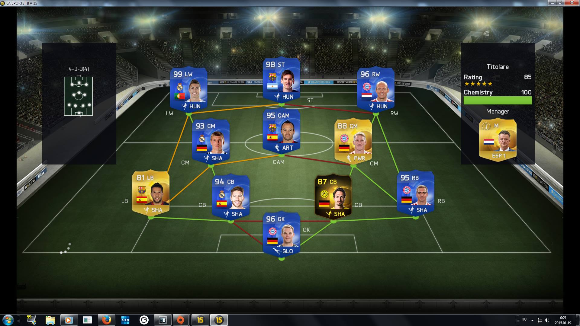 Üdv.! Sokféle arany csapatot építettem a 15-ben.Minden liga,minden játékosát próbáltam már szinte(kivétel Ronaldo...sajnos) mindenféle variációban! Mivel minden ezüst játékos megvolt ezért kipróbáltam a csapatod!Szerencsére!!!Ebben a felállásban még nem is játszottam mert a 4-3-3(5)-öt favorizálom,de szenzációs a csapat!!!Ezek úgy mennek hogy komolyan hihetetlen!Utolsó percben is mennek,nem fáradnak,és tényleg verhető velük komoly arany IF lapokkal tele csapat is!Utolsó meccsen velük,egy 86-ratingos Bundesliga csapatot vertem le.Írtam a gyereknek meccs elején hogy szép csapata van!Köszönte.3-0-nál is ugyanez akkor már nem köszönte,csak írta hogy nem érti ezt! Labdabirtoklás 67-33%-ide,lövések 14-4-ide,a meccs meg sima volt! Nagyon jó eddig velük tolni,remélem nem fordul itt is a kocka mint a többi csapatomnál! Jó lenne csapatba rakni [link]Ike Opara(CB) -t (próbáltam brutális volt hátul)de nem tudom csak gyenge chemmel berakni.Ha van valami ötleted hogyan lehetne valami jó hybridbe berakni szívesen látom!Illetve ha van jó Silver csapatra is ötleted az is jöhet,mert szerintem jó velük tolni! Köszi