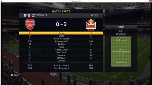 Az ellenfelemnek talán nem tetszett annyira, mert egy röpke szünet után a játék átváltott diavetítésbe és kaptam is két gólt csak úgy, mert... Szó szerint csak tippelgetni tudtam merre jár a labda, majd a meccs 70. percében jó adag mázlival kiegyenlítettem. A gyerek erre nagyon megorrolhatott, mert felrakta teljesen támadóra a taktikát és hát ez Lacazette számára még ilyen körülmények között is csemege, szóval pikk-pakk jött a következő gólom, ellenfelem újra megállítja a játékot és pár másodperc múlva újra vaj simán futott tovább a játék, és hát ez lett szegény hülye gyerek veszte, mert még varrtam neki egy párat 10 perc alatt.