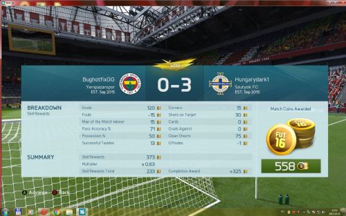 60-40 labdab.szóval megvan a stílus, a győzelem/vereség általában a handi által lesz eldöntve, múltkor 3 kapufával kezdtem, aztán persze egy kapufás góllal első lövésbőlé 0-1 lett. kitámadtam, végén jött egy kamutizi, 0-2. kiléptem, nincs időm a kamumeccsekre, leszarom a dnf modifiert.