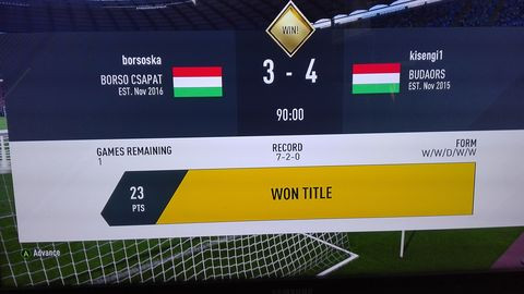 Múlt héten sikerült kiesnem div 2-be, de csütörtökön bajnokként jutottam fel és vasárnap délután lejátszottam 7meccset 5győzelem 2 döntetlen ott éreztem hogy meglehet gyorsan abba is hagytam mert már kezdtem ideges lenni az esti meccs miatt, (Real Madrid campeones