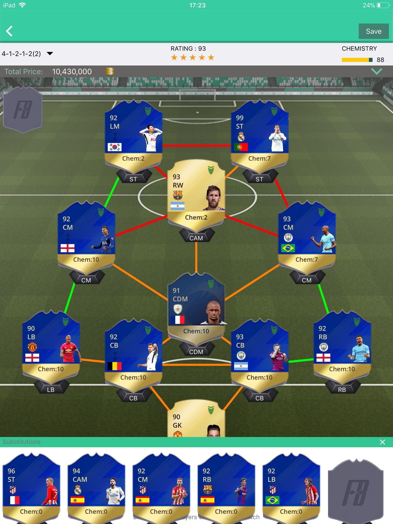 Jelenleg ilyen a csapat. Bármilyen változtatás amit a jövőben eszközölhetnék? Ha mondjuk ikon akkor végső esetben akár Crespot is felhasználhatom, de az fájdalmas lenne... A védelmet okénak érzem, ott max egy ikon segítene. Esetleg egy "jobb" De Gea? 100k-m van most, de hátha jön még valami jó húzás.