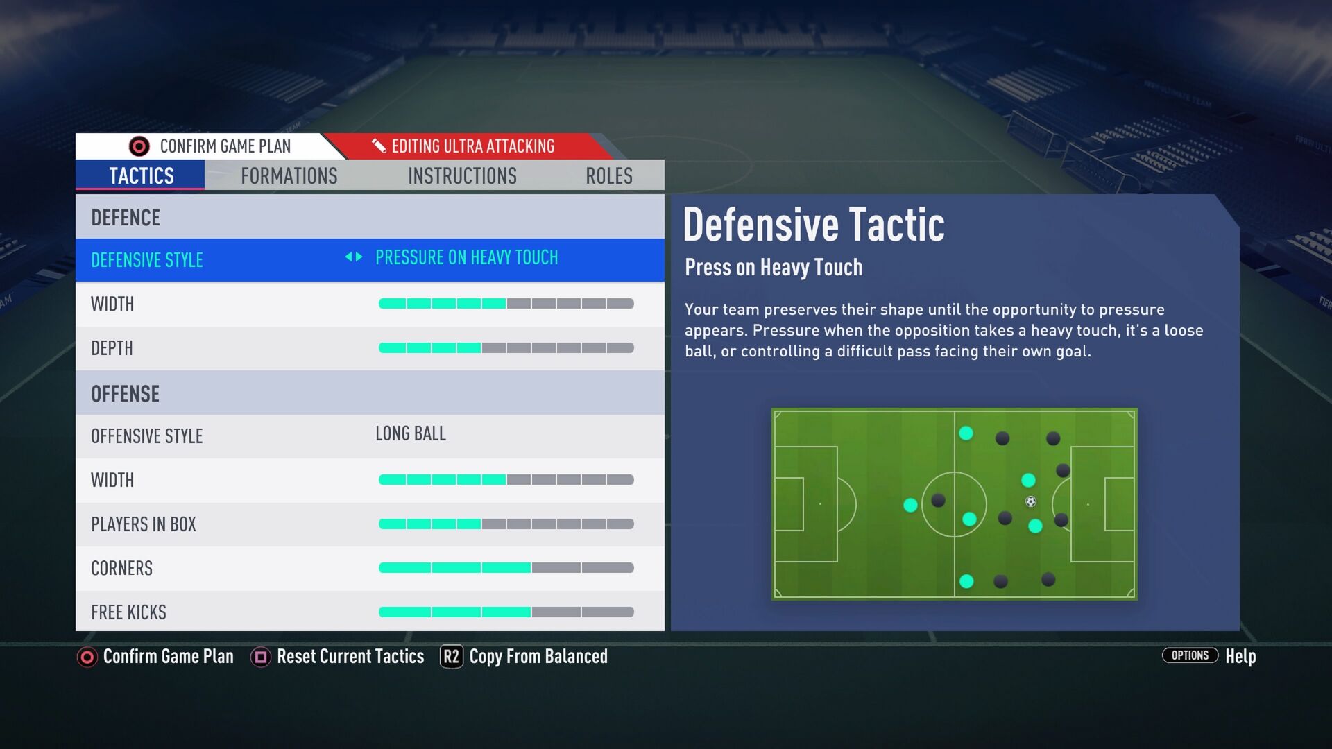 Az instrukciókon meg a WR-en van a hangsúly szerintem. Nálam ugye CR H/L, kap egy get in behindot, Henry M/M ő is get in, viszont rátettem egy stay forwardot is, Hazard H/M stay forward, bal CM stay back, CDM stay back cover center, RCM semmi, szélső védők stay back.