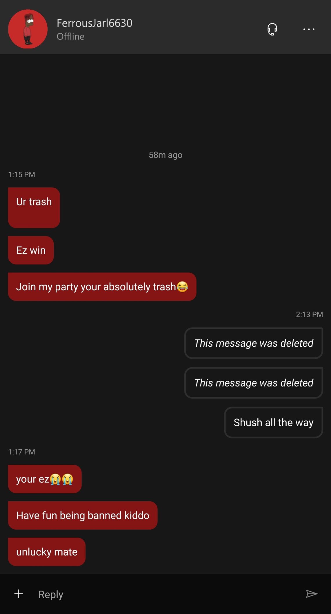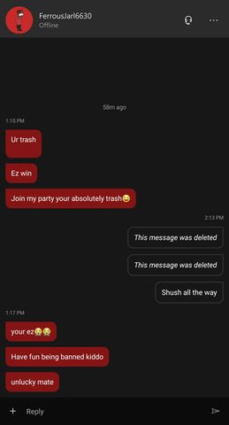 Az mi hogy rámír a csicska, hogy ur trash. Visszaírok neki hogy tryhard 8 year old. Erre jön az email egyből, hogy holnap délutánig bannolták a fiókom kommunikációs cuccait