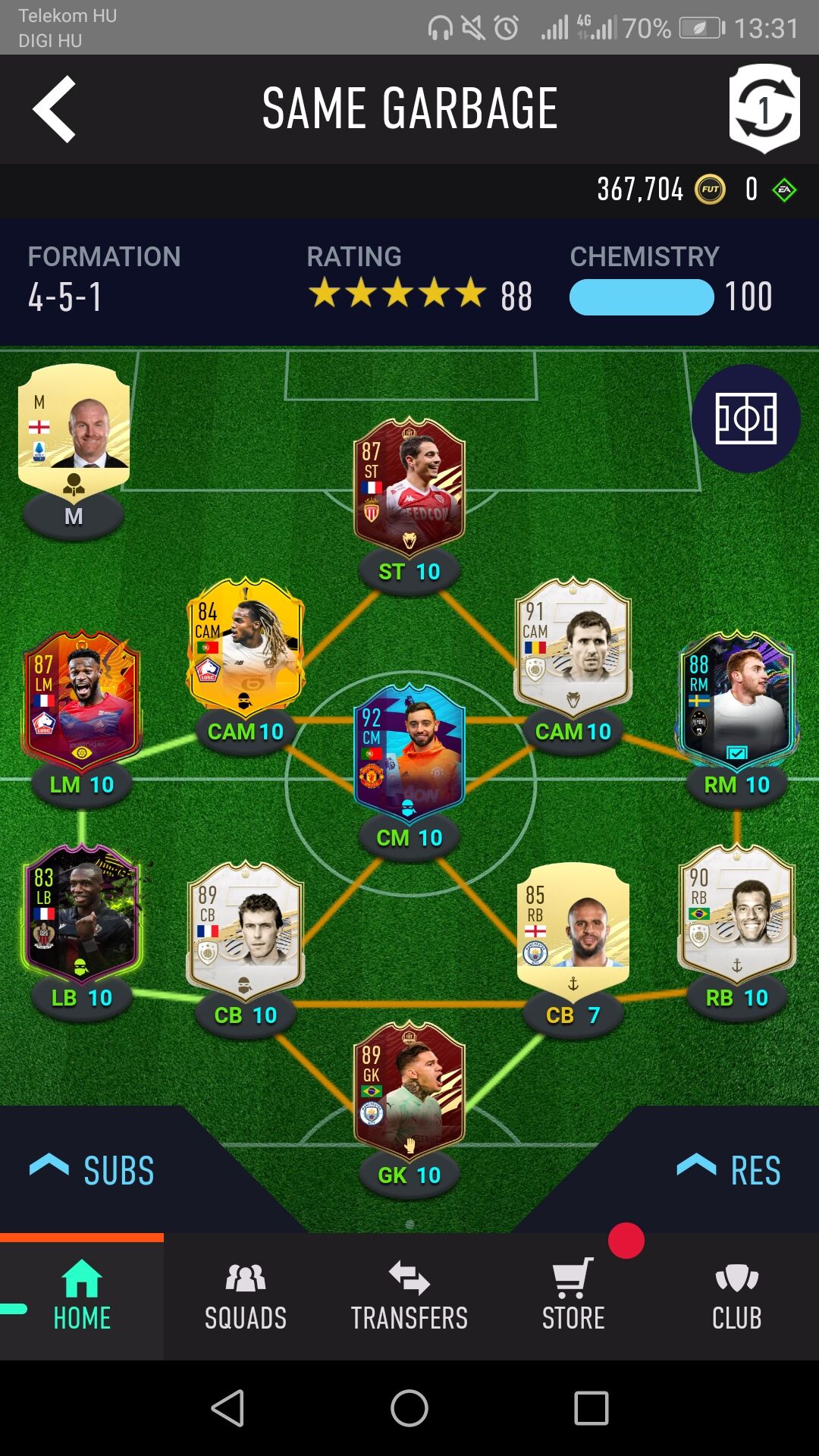 Tegnap elkezdtem tesztelni az új csapatot. Hát nem túlzok amikor azt mondom, a gold csapattal 3x jobban ment a játék. Azt hittem kihajítok vmit az ablakon... Nem tudom mi lehetett az oka, a gigantikus delay (ami persze 90%ban jelen van), hogy Hagi 1.5 mpig tutujgatja a labdát mire elpasszolja, holott instant nyomtam a gombot, vagy POTM Fernandes nem tud egy egyszerű passzt megoldani... Vagy csak új a csapat és meg kell szokni őket... Nem tudom, de nagyon csalódott voltam