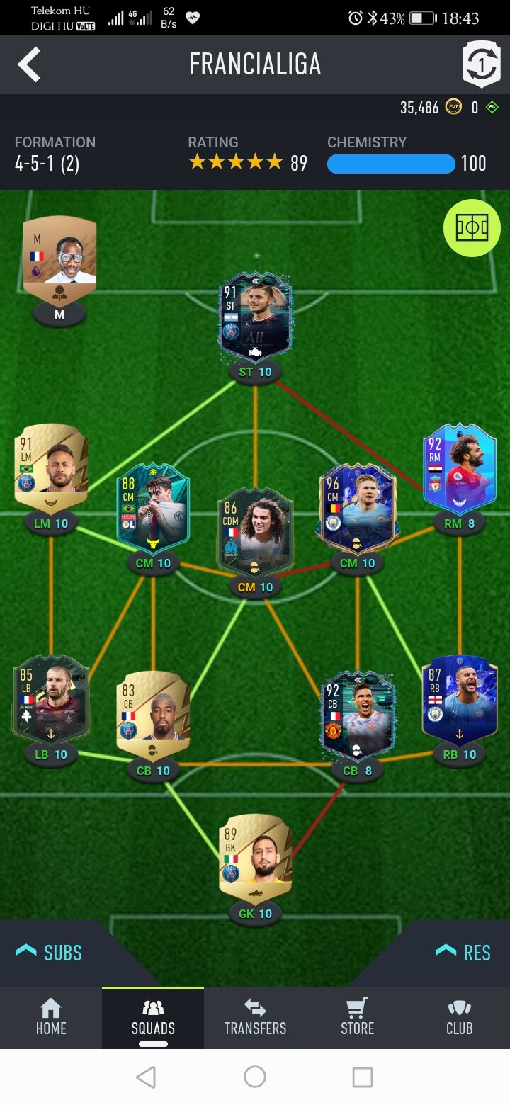 Meg van 1m coin. Mondjuk nem vagyok meggyőzve róla, hogy annyira megéri beépíteni, alap KDB-vel se nagyon találkoztam az elmúlt 4 hónap alatt.gjoe: igen, kb. 3-4 meccsen már az volt, olyan nagyon nem győzött meg, egy meccsen volt csereként kiemelkedő, ott kb. 20-25 perc alatt gól+gólpasszig jutott. De mi kerül ezen a lapon 1.8 millióba, azt nem értem. Persze, tudom, csereként 5 chem (ezért akartam kezdőbe építeni), de na, amikor 71 chemes csapatok jönnek szembe.. és nem érződik rajtuk..