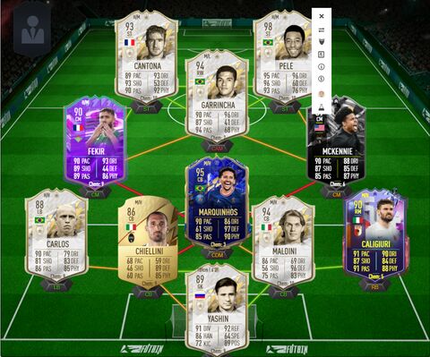 ) és így most 5 védősből indítva Maldini és Chiellini a CB, Marquinhos pedig a CDM, de Lahmot is ki akarom majd rakni mindenképpen.Így két lehetőség van a fejemben. Vagy vagy kirakom Lahmot is, marad a mostani 4-1-2-1-2, és Lahm all around CM lesz (McKennie van most azon a poszton), de nem tudom, így mennyire érvényesülne Lahm. Vagy szintén kirakom Lahmot, és újra megpróbálkozok a 4-2-2-2-vel, amit egyszer próbáltam idén, de akkor borzalmas volt. Így Lahm és Marqui lenne a CDM, a 4 támadó pedig Garrincha, Puskás, Pelé és Cantona valamilyen elosztásban. Így sajnos BD Fekir kimaradna, illetve a 4-2-2-2-től tartok.