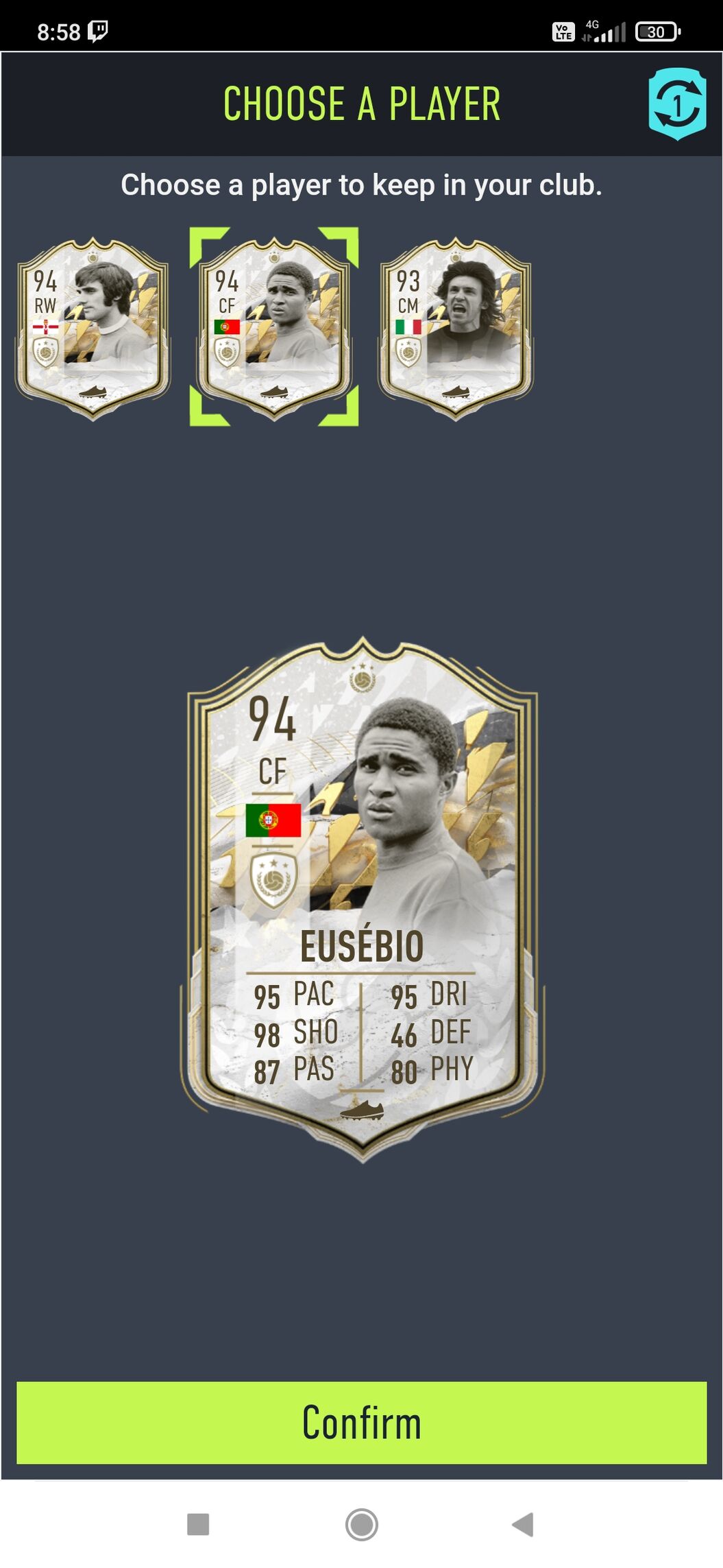 ja ő már nálam is padozik, de igazából csereként se nagyon jön be. De legalább van egy Ronaldo a klubban, én ezeket annyira nem bánom mert úgyse lett volna jobb amibe pakoltam volna a foddert akivel meg nem játszok néhány klub legendet kivéve belebaxom sbc-be akármilyen drága vagy nagy ratinges. -