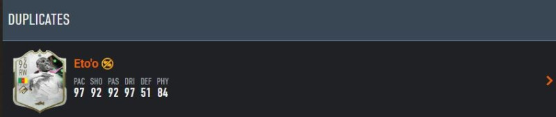 Volt is 2 Etoo a csapatomban. Az egyiket ugye használom, de volt egy másik (fingom sincs hogy mi a különbség), azt valahogy be is raktam SBC-be, de ezt nem tudom, csak úgy ha azt rakom be ami jelenleg a csapatomban van (gondolom én), de akkor elvesznek annak a statisztikái? Azt nem szeretném, mert ő a legrégebbi playerem, és ő az aki valszeg végleg a csapatban is marad..