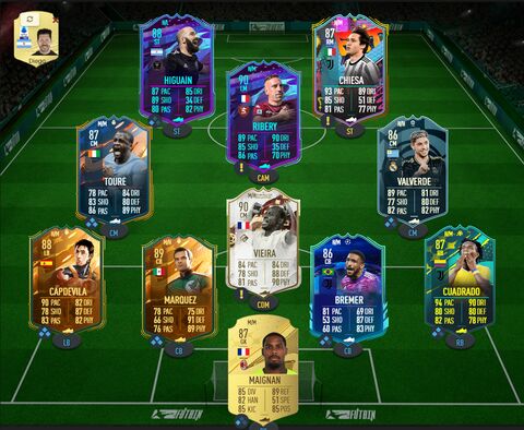 Én kiraktam Cuadradot, bár elég drága sbc lett, gondolkoztam is rajta, de végül érkezett. Gondoltam húzok vele egy meglepőt, és CM lesz, igazából majdnem Gullit gang, gyors, 5-ös SM, Gladiator chemmel a shooting és a def is teljesen rendben van, úgyhogy ott is jó lehet szerintem. Ingame továbbra is 41212, Valverde, Delaney, Cuadrado középpálya, Ribery cam, Chiesa-Higuain csatársor.