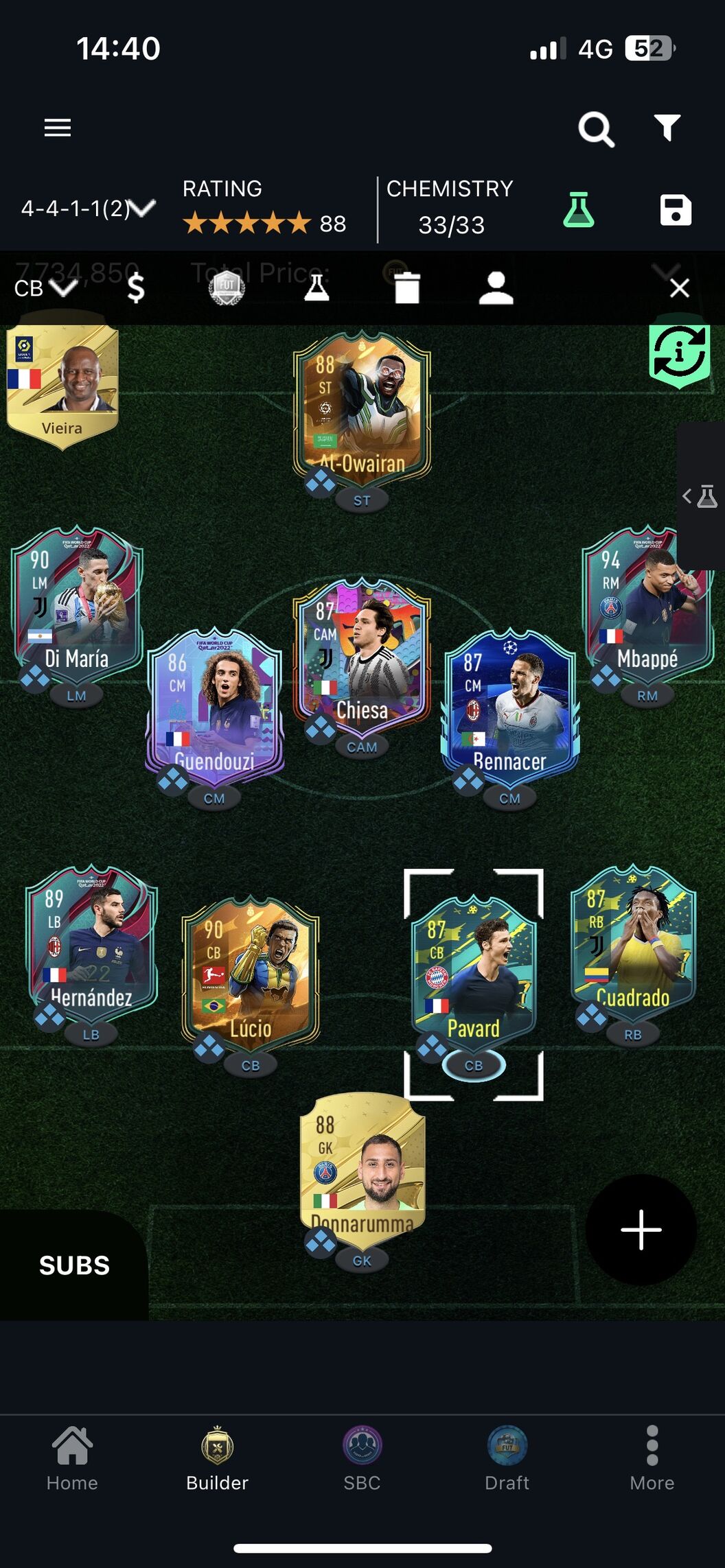 Én Chiesa-t 2 meccs erejéig próbáltam CAM -ként , nekem annyira ott nem jött be . Dybala OTW helyen volt , de Dybala jobb sztem . Labdabiztosabbnak éreztem . Sokszor indokolatlanul sután vette át a labdát (amivel Dybala-nak nem volt gondja ) , ezért sok labdát vesztettem . Anno mikor a gold lapját használtam bal szélsőként ott jobban muzsikált nálam . Közepén nekem ez a promo lapja nem jött be (szélre meg nem tudom rakni , ott TOTW Salah tanyázik, akit nem kívánok lecserélni rá (sem).