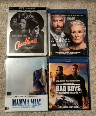 Casablanca és a Mamma Mia 2 az 4k UHD és steelbook, a másik kettő meg sima tokos, de mindegyik magyar vonatkozású.