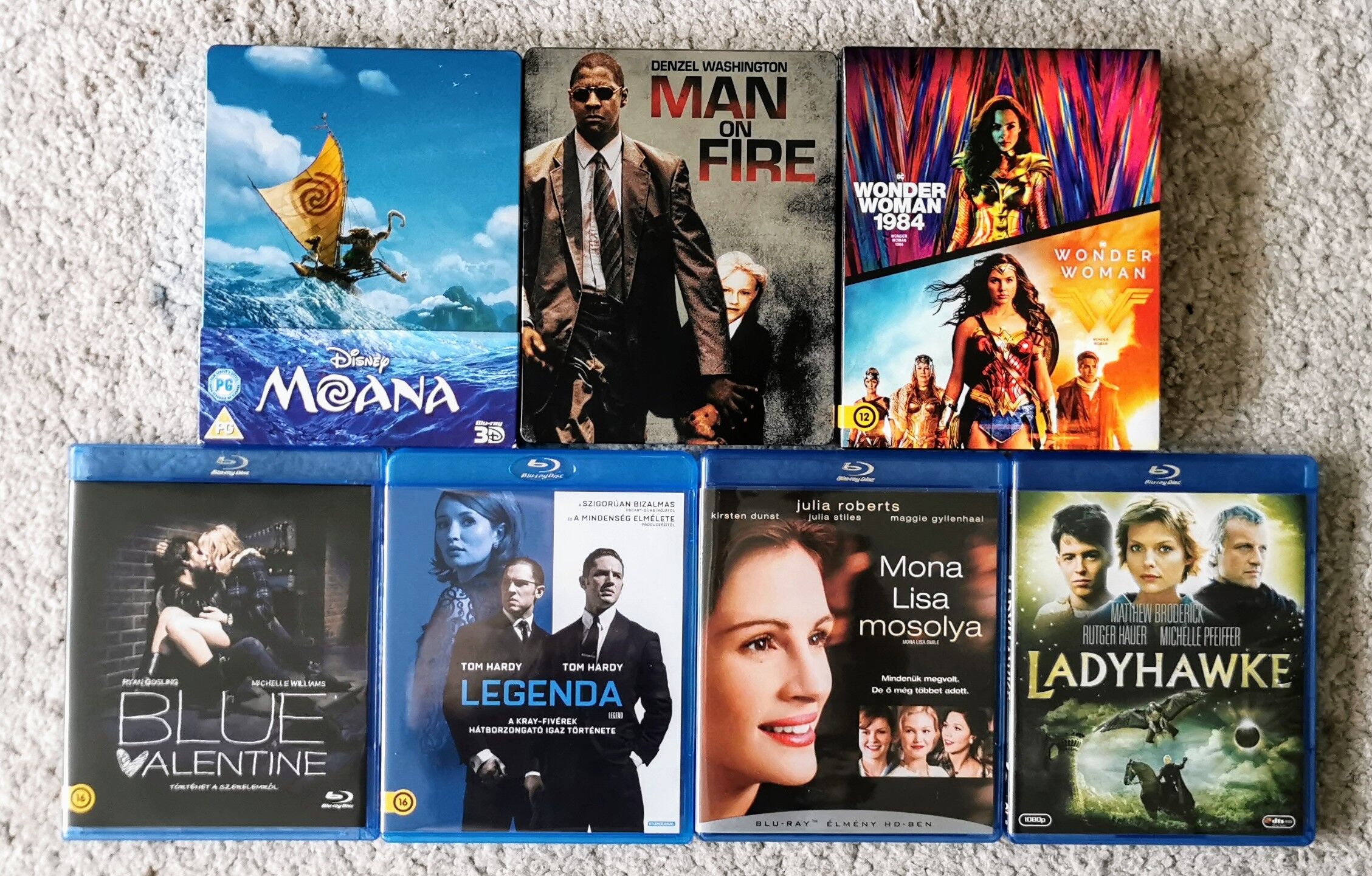 Az elmúlt napokban sem voltam teljesen tétlen, ami ezt a hobbyt illeti, az alábbi szerzeményekkel bővítettem a kollekciómat. 2 remek steelbook kiadvánnyal megfűszerezve. A Man on Fire steelbookba, beleraktam a spanyol bluray lemezt, mert azon van teljes magyar vonatkozás, ezen az angliai kiadványon nem szerepelünk. A Moana meg 2D és 3D kiadás, azon nem vagyunk rajta, a többin igen. A Wonder Woman 2 filmes pakk 4k UHD formátumon és BDn.