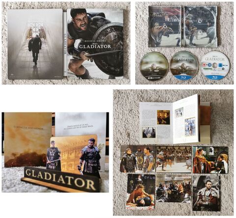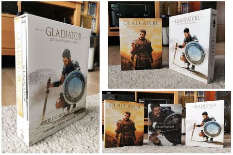 Ami meg az egyik abszolút kedvenc filmemet illeti, igazán megérdemelte ezt a kiadást és csomagolást a részemről. Ez pedig nem más mint az idősebbik Scott rendező csúcsa a Gladiator. Ahogy azt a képeken is láthatjuk, ez a kiadvány tartalmaz 4k UHD, BD és bonus lemezt egy gyönyörű steelbookban, mögötte meg egy 32 oldalas részletes leírás a színészekről, rendezésről és a produkciól igényes színes fotókkal fűszerezve. E mellé kapunk még 6 képeslapot a film jeleneteiből és a hab a tortán meg egy vastag préselt kartonból összerakható mobiltartó.