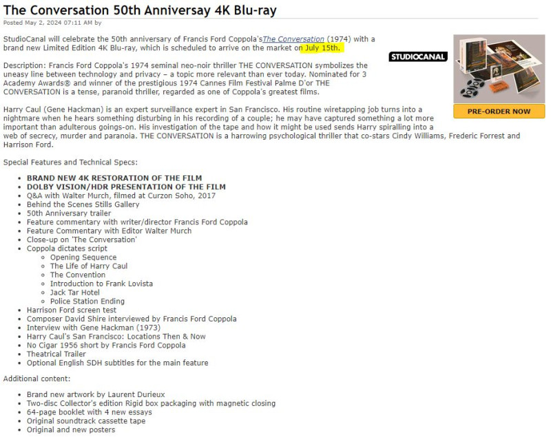 The Conversation (1974) alapmű érkezik 50. évfordulós alkalmából júliusban. Teljesen új 4k és Dolby Vision/HDR mastert kap a film. Coppola egyik remekműve: