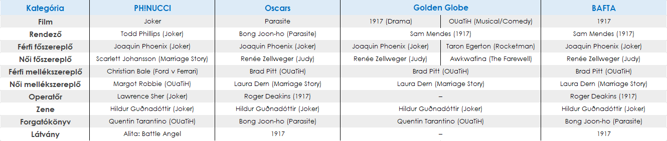 a mezőny legjobb filmjei toronyagasan. Irishman, 1917, Joker. ezeknek kellett volna vinni kb. mindent. A Dark főnixnek, meg a zenéért, hangért. a parazita ugyanolyan hulladék mint tavaly a róma, vagy előtte a shape of the water volt.