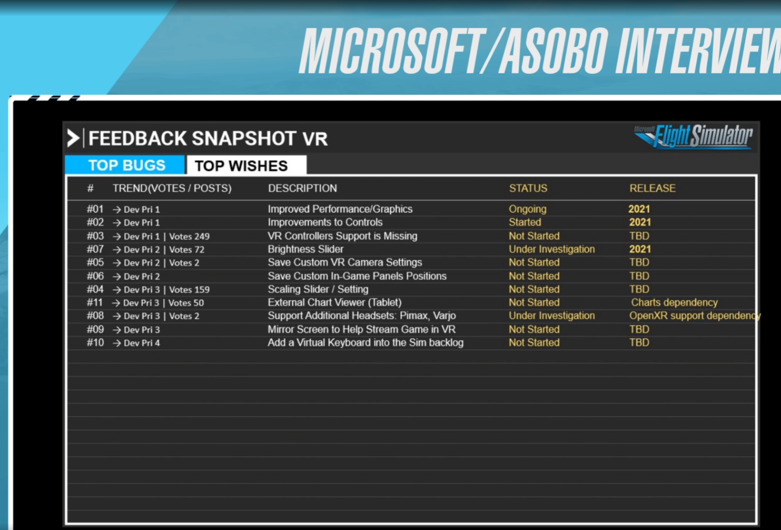 Valaki felvetette a napokban, hogy mi újság az FS2020 VR fejlesztésekkel? Hát elég szarul állnak, amint az alább látható. Volt egy kb órás Twitch [beszélgetés] a főnökséggel, ott az hangzott el, hogy a fontosabb pontokat év végére igyekeznek megcsinálni, a többi (not started kategória) marad jövőre.